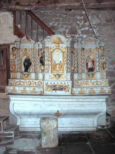 Cène en bas relief au centre des gradins. Calvaire avec sainte Madeleine (le Christ crucifié a disparu) sur la porte du tabernacle. Dieu le père au fronton de l'armoire eucharistique, bustes de la Vierge et du Christ en médaillons au-dessus des niches des ailes. Dans les niches des ailes et des pans coupés de l'armoire, de gauche à droite : statuettes de moine (saint Antoine de Padoue ?), saint Jean-Baptiste, et de deux saints évêques.