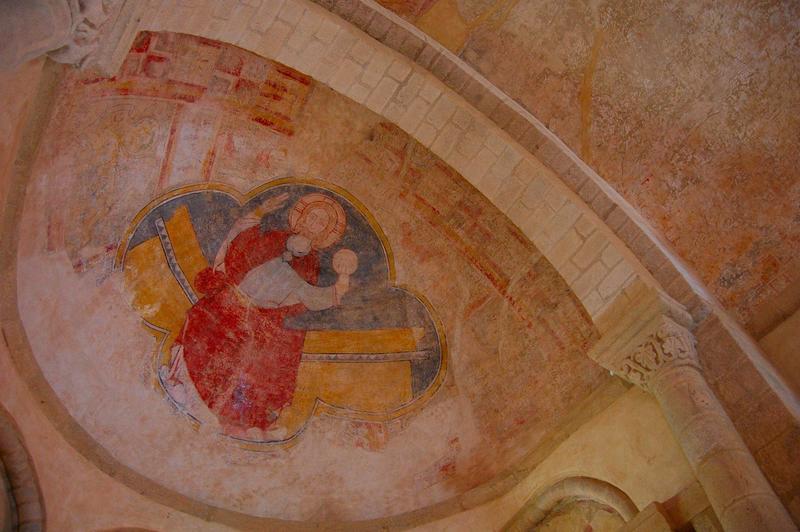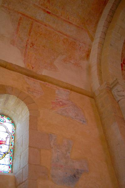 Sur le cul-de-four trône le Christ en majesté. Entouré d'une mandorle quadrilobée, il est assis sur un vaste trône, il bénit de la main droite, et de la gauche tient non pas le livre, mais le globe de l'univers, affirmant sa qualité de maître et de sauveur du monde. Il est entouré des symboles des quatre évangélistes portant des phylactères : seuls l'ange de saint Matthieu et le lion de saint Marc sont encore discernables. La composition est très compartimentée, chaque symbole d'évangéliste étant représenté dans un cadre réparti à partir de la mandorle. Une frise d'anges alternant avec des motifs de méandres correspond à la cohorte céleste. Le mur méridional de la travée droite du choeur a conservé une scène fragmentaire : un personnage qui semble nu est allongé, au-dessus, une figure en buste, auréolée et entourée de nuées, bénit de la main droite et tient le globe terrestre, de chaque côté un personnage chauve paraît tirer un bâton. Il s'agit probablement de la représentation d'un martyre, dont l'attribution reste hasardeuse : le supplicié pourrait être saint Laurent, car le fond où est figuré son corps a l'air quadrillé comme pour illustrer un gril. Les deux petits personnages sont des bourreaux comme l'indiquent leurs particularités physiques : la calvitie était signe du mal, les traits de leur visage sont grossiers, notamment pour l'un qui est affublé d'un nez vertigineusement allongé. Ils tiennent sans doute les piques servant à maintenir le martyrisé. Le personnage en buste doit être le Christ puisqu'il tient le globe, ainsi figuré pour accueillir le saint supplicié, affirmant la promesse du Paradis éternel, suite au martyre. La voûte de la travée droite du choeur ne comporte aucune scène historiée, seulement des motifs de fleurs de lys composées, compartimentés dans des cadres rectangulaires, motifs végétaux que l'on retrouve sur l'ébrasure de la baie axiale. Scène lacunaire non identifiée sur le mur nord de la travée droite du choeur.