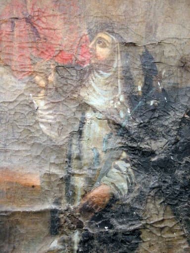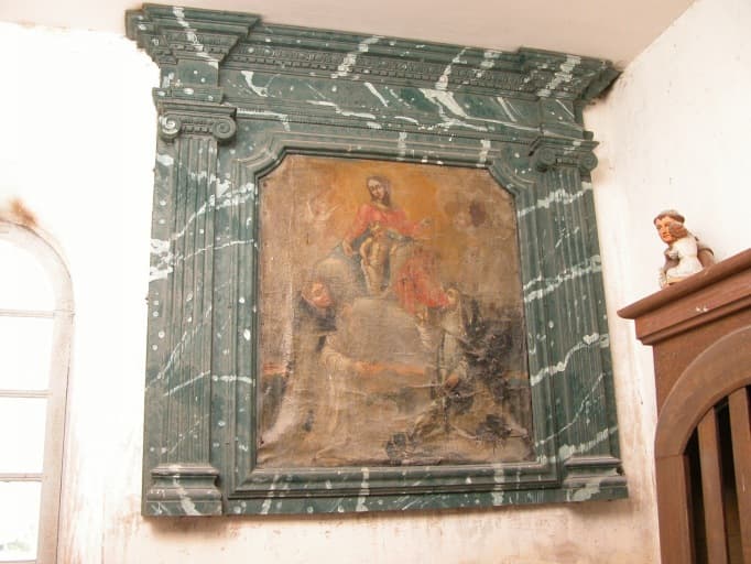 élément de retable et son tableau d'autel : la Remise du rosaire à saint Dominique de Guzman et sainte Catherine de Sienne