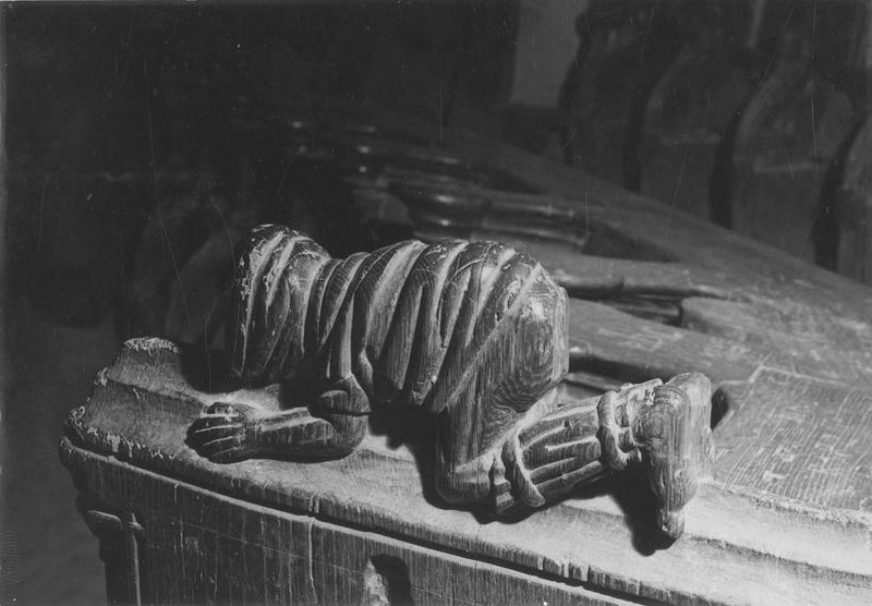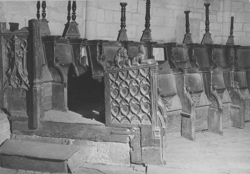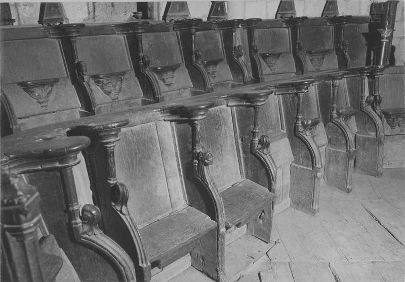 Stalles exécutées au 15e siècle pour la collégiale de Capdrot (canton de Monpazier) ; transportées, sans doute entre 1495 et 1505, à Monpazier, et complétées au 17e siècle ; les hauts dossiers et couronnements furent détruits à la fin du 19e siècle, sous le ministère du curé Rey ; bibliographie : L'HONNEUR (R.), ' Monpazier, logis, gens et faits d'autrefois ', Nérac, Br., S.D. ; CHAUVET (Stephen), « Les stalles de l'église de Monpazier », Bull. Soc. Hist. Archéol. Périgord, 1940, tome 67, P.74 77