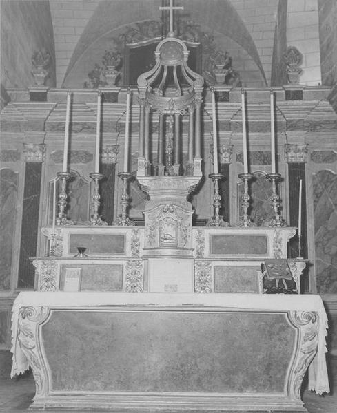 Autel galbé, peint en faux marbre ; double gradin ; tabernacle rectangulaire à fronton et porte chantournés ; dais d'exposition : 6 colonnes corinthiennes à fût lisse portant un entablement concave surmonté de 6 volutes affrontées couronnées d'un cul-de-four en plein cintre