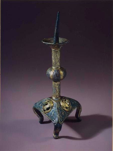 Le socle du chandelier, base triangulaire, repose sur 3 pieds, plats, galbés. La partie supérieure externe des pieds est gravée. Chaque triangle du socle est décoré de motifs d'émaux champlevés et comporte un médaillon central en relief. La tige cylindrique est constituée de 3 pièces : un noeud situé entre 2 éléments de même taille. Les éléments cylindriques sont gravés de motifs en écailles et le noeud de 6 quartiers incrusté d'émaux. La bobèche, les éléments cylindriques et le noeud sont assemblés par une tige constituée par la pointe qui émerge de la bobèche et qui traverse l'ensemble ainsi que le socle ; elle est rivetée sur une bague à l'intérieur du socle.