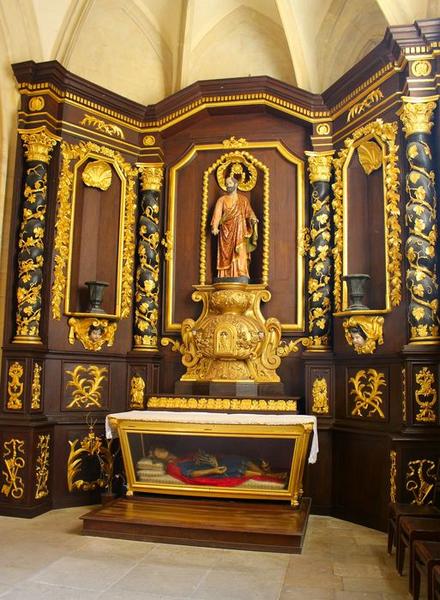 Retable de type 'paravent' ou 'triptyque'. Autel-châsse contenant un gisant. Tabernacle-urne orné d'une scène du Nouveau Testament. De chaque côté du tabernacle, piédestaux ornés de panneaux.