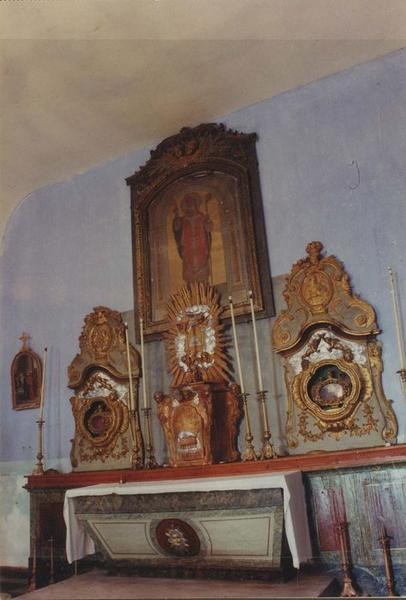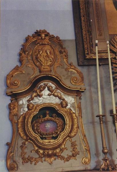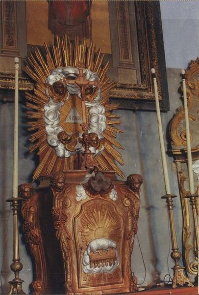Sur la porte du tabernacle trapézoïdal : l'agneau aux sept sceaux. Au-dessus, deux têtes d'angelots ailés ; chaque arête est décorée d'une tête d'angelot ailé d'où part un bouquet tombant d'épis et de grappes. La gloire est constituée d'un triangle rayonnant portant le nom de Yaweh en hébreu. Les nuages argentés qui le supportent sont décorés de quatre têtes d'angelots ailés (celle du bras droit présentant un profil droit horizontal). Les ailes présentent un riche décor de guirlandes de fleurs. Sous un cadre arrondi, deux angelots volants en symétrie, une fleur dans la main droite. Au-dessus, boiserie à volutes, médaillon central sommé d'un pot-à-fleurs : à gauche, l'Annonciation, à droite, sainte Jeanne de Valois.
