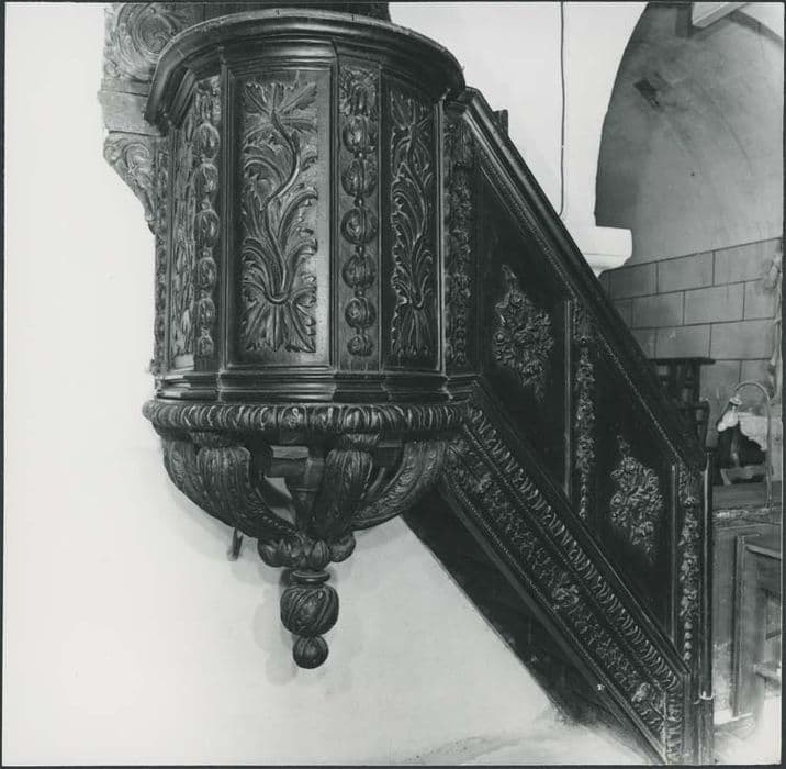 Escalier à sept marches, deux panneaux sculptés de fleurons, rampe moulurée. Base sculptée. Cuve polygonale, trois panneaux encadrés de chutes de feuillage. Bas sculpté d'un tore. Pendentif de cinq branches portant deux gros boutons. Fond à deux panneaux simples encadrés de chutes de feuillage et d'ailerons. Abat-voix mouluré, sculpté d'une vaste coquille et portant six bras incurvés sommés d'une couronne et d'un pot à feu.