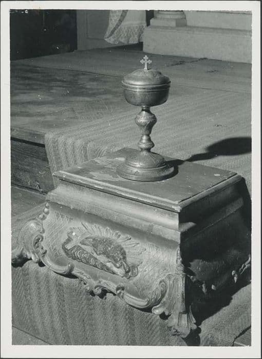 Pied gravé de palmettes, deux noeuds, l'un petit et l'autre plus important. Coupe lisse, couvercle gravé de feuillages et sommé d'une croix.