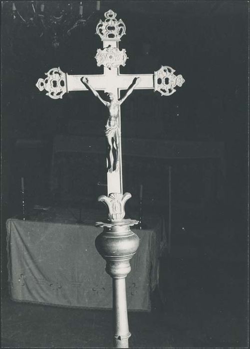 Base à turgescence piriforme ou bulbeuse, surmontée d'une collerette découpée. D'un fleuron sort la croix dont les branches sont terminées par des éléments baroques, découpés. Christ aux bras très relevés.
