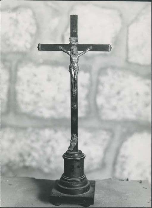 Croix de bois noir fixée sur un socle carré portant un élément tronconique, tourné. Haute croix terminée par des boutons de cuivre et des viroles. Au pied de la croix, pièce métallique figurant la Vierge à l'Enfant.