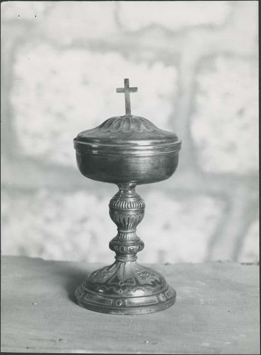 Pied orné de rinceaux et cartouches en méplat. Bague à grènetis. Noeud ovoïde à cannelures, coupe classique, couvercle sommé d'une croix.