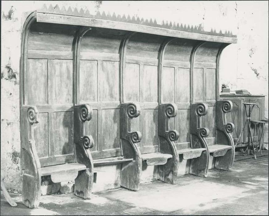 Série de cinq stalles au nord, quatre au sud. Sièges sans miséricordes. Séparations sculptées de deux enroulements. Boiseries de fond très rustiques, à panneautages réguliers.
