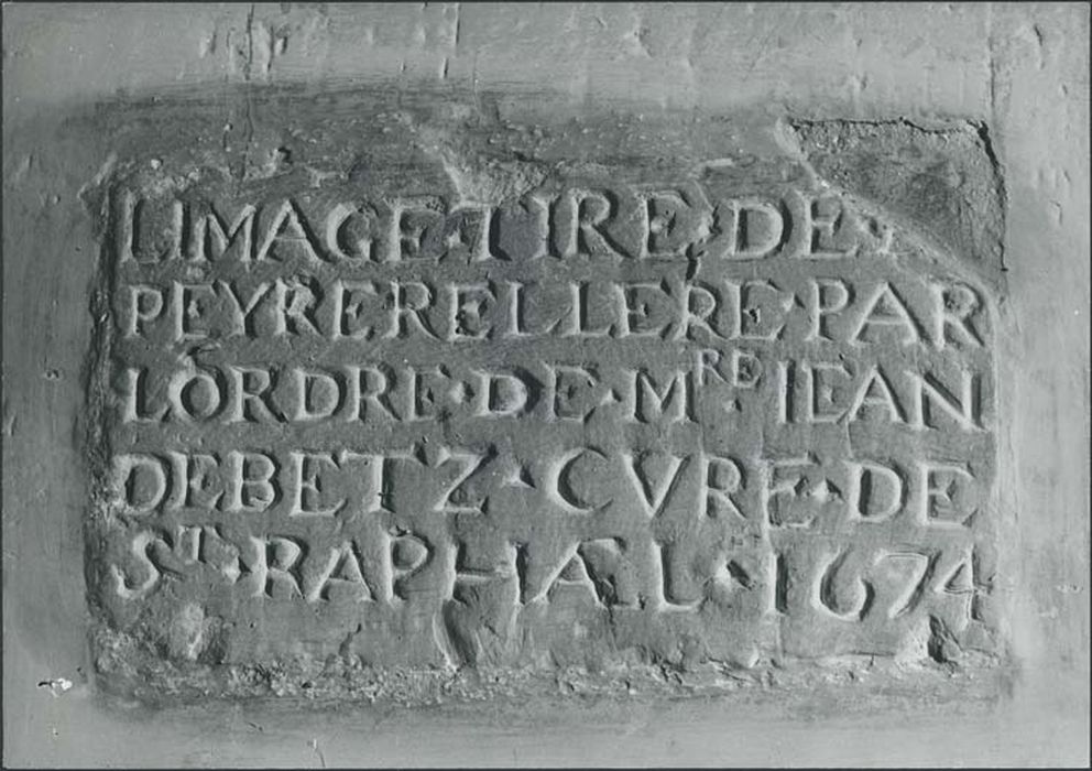 Inscription : LIMAGE. TIRE. DE (LA) – PEYRE RELIERE. PAR – LORDRE. DE. Mre IEAN – DEBETZ. CURE. DE – St RAPHAEL. 1674.