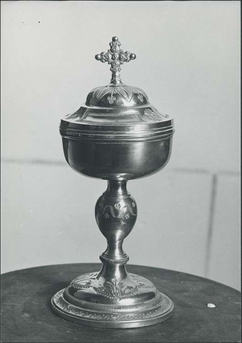 Pied gravé de cannelures, palmettes, guirlandes et fleurettes. Noeud ovoïde gravé d'ondes et de fleurons, au-dessus d'une bague cannelée. Coupe large et plate. Couvercle gravé de fleurons, sommé d'une croix décorée de feuillage.