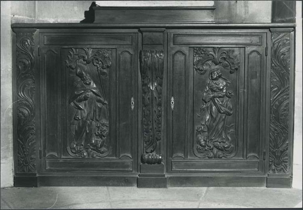 Placard à deux portes sculptées de deux bas-reliefs : sainte Marthe écrasant la Tarasque et saint Front écrasant le coulobre.