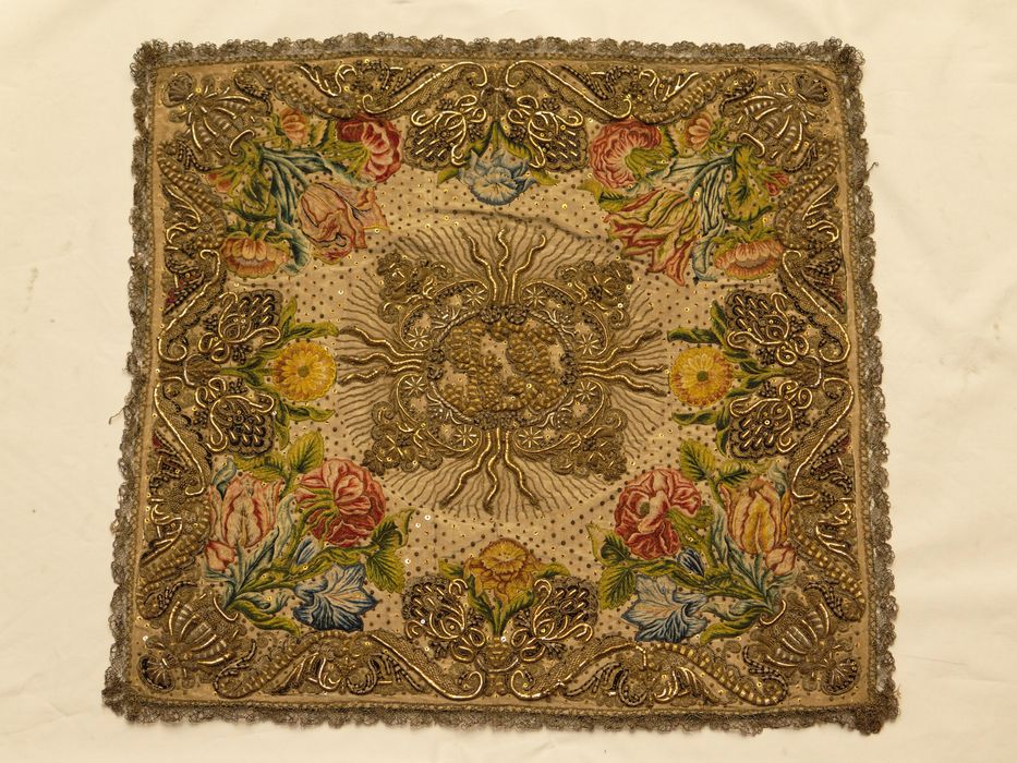 Ottoman de soie blanche brodée de fils d'or et d'argent, perles, fils de soie de couleurs, filé, lame argent, semis régulier de paillettes et cannetilles or, garniture de col en dentelle blanche, bougran, doublure de soie vert émeraude. Soies brodées au passé empiétant, peinture à l'aiguille, fils métalliques guipés. Broderie en relief.