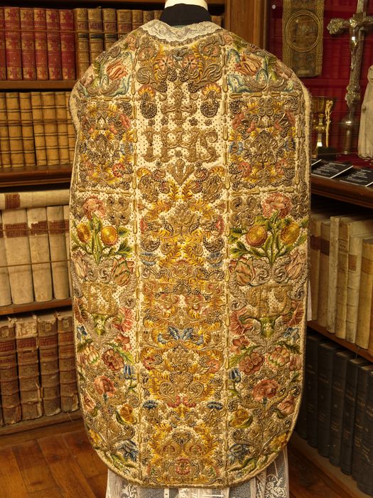 Au chiffre SFDS en broderie de fil métallique (sur le voile et le dos de la chasuble).