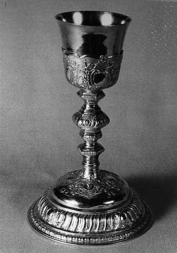 Armoiries : blason ovale flanqué d'un pélican et d'une oie (sous le pied). Inscription : ex dono dominae viduae de Vanne, 1807 (sur le rebord du pied).