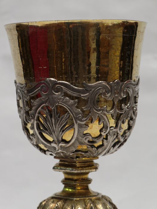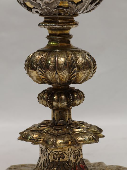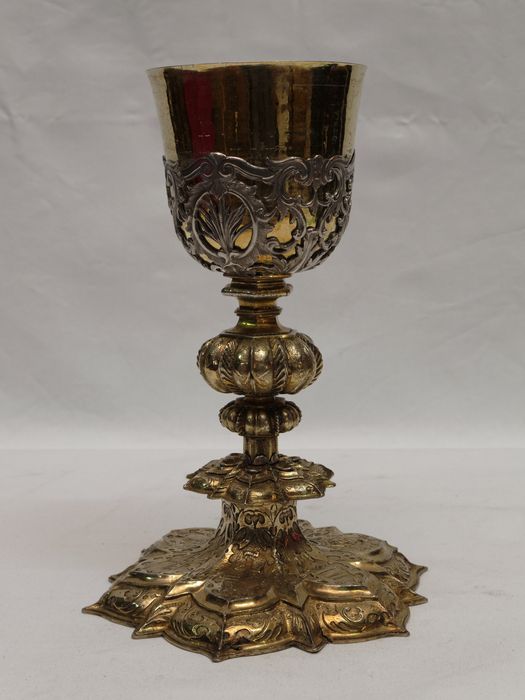 Oeuvre provenant de l'église Saint-Maurice. Le pied, la tige et le noeud (art italien) sont de la fin du 16e siècle ou du début du 17e siècle, tandis que la coupe et la fausse coupe ajourée sont du 18e siècle.