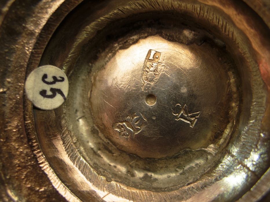 Poinçon : x couronné (sous le pied). Lettre-date : K (pour 1774-1775, sous le pied). Poinçon de maître : de J.-F. Rouhier (sous le pied).