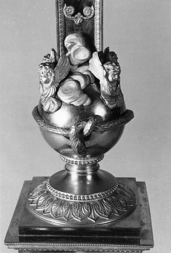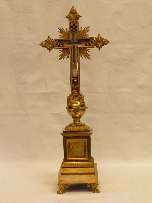 Pied en patte de lion. Socle : Crucifixion ; Agonie au Jardin des Oliviers ; Résurrection ; frise de feuilles. Croix repose sur un globe avec le serpent et des têtes d'angelots ailés émergeant de nuées. Fleurettes au bout des bras de la croix ; rosettes sur les bras de la croix ; rayons de gloire autour de la croix. Petite croix à extrémités fleurdelisées à l'intérieur de la croix.