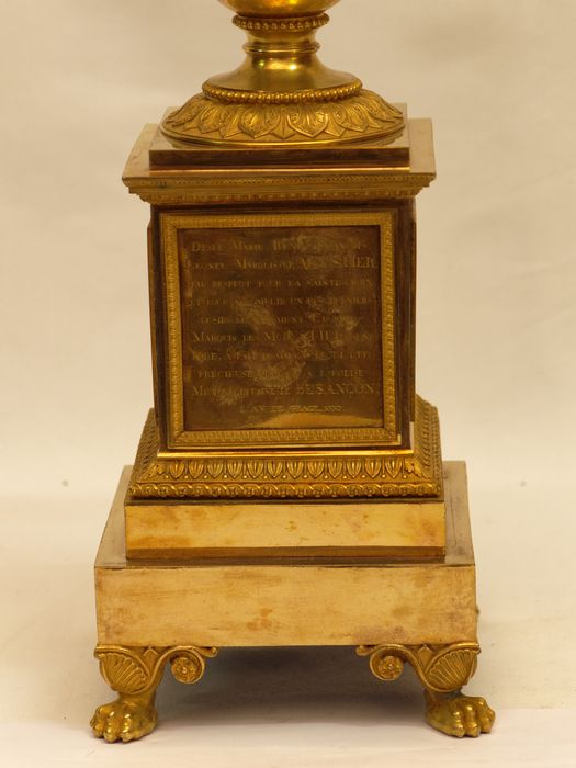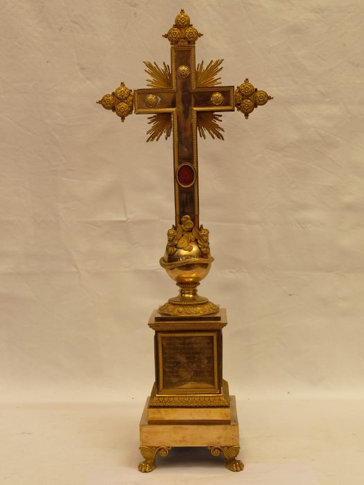 Inscription au dos du socle (en capitale) : Desle Marie, René, François, / Léonel Marquis de Moustiers / par respect pour la Sainte Croix / et pour accomplir un des derniers / désirs de Clément Edouard / Marquis de Moustiers, son / père, a fait hommage de cette / précieuse relique à l’église / métropolitaine de Besançon, / l’an de grâce 1830.