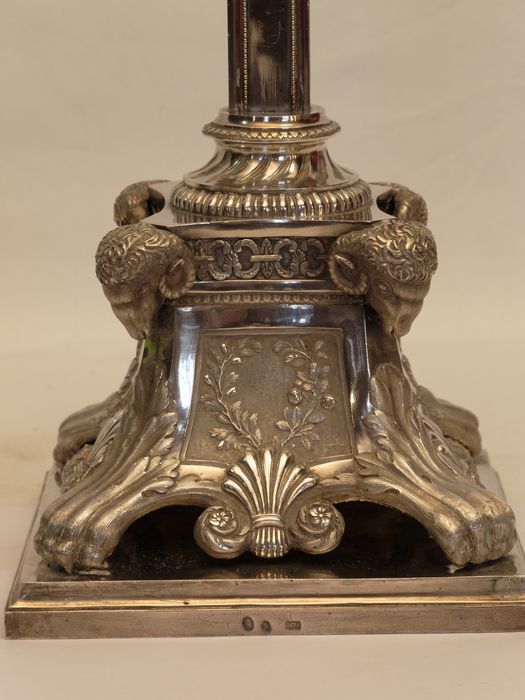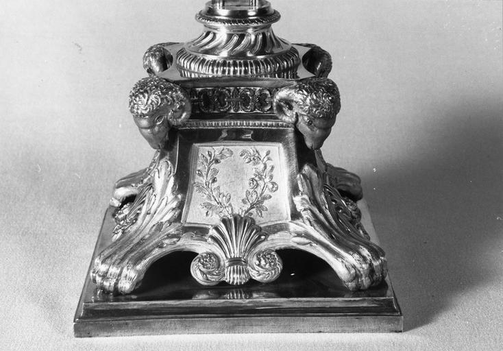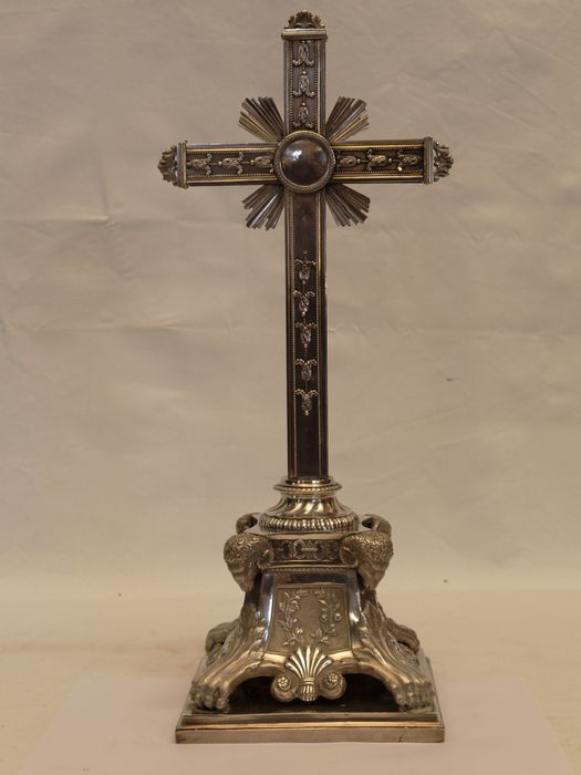 'Pied en griffe de lion. Sur chaque face du socle coquilles et enroulement de feuillage. Au sommet du socle, quatre tête de béliers et palmes, rameau d'olivier. Rayons de gloire autour de la croix et fleurs.