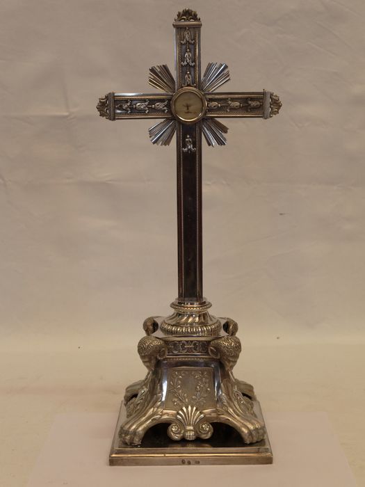 Fonctions combinées. Croix-reliquaire en argent. Socle carré et quadripode.