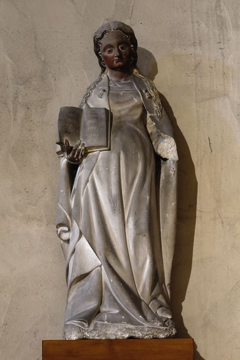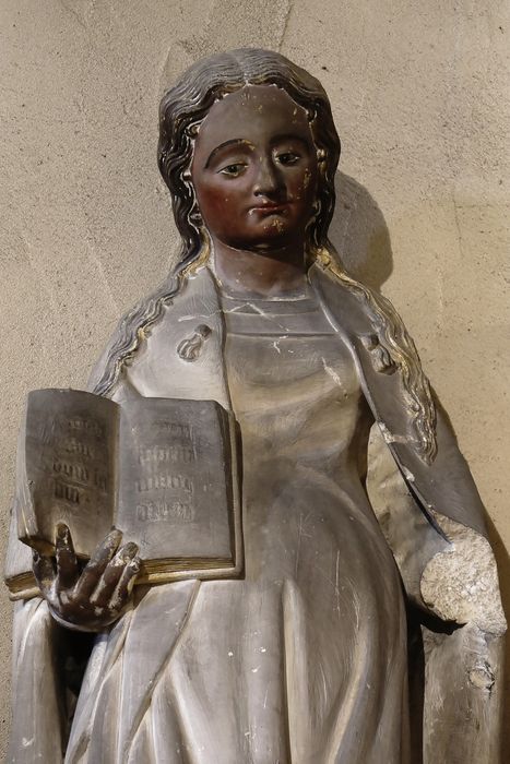 Cette statue présente des traces de polychromie. Statue de sainte Cécile en pierre peinte, polychrome. Cette statue présente des traces de polychromie (sur la tête et les cheveux, le côté du livre, la main droite, sur le pied gauche).