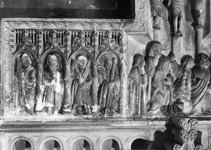 Inscription donnant l'identité du modèle (gravée) : nom des apôtres (au bas des figures).