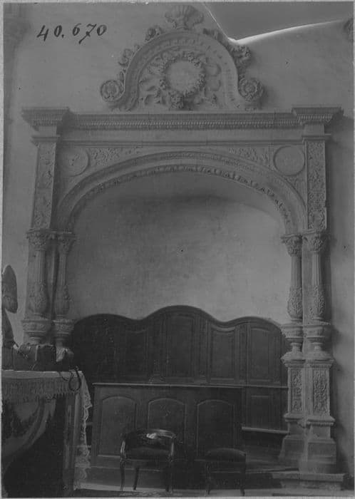 Un arc surbaissé en anse de panier est porté par deux colonnes cannelées reposant sur un pilastre sculpté. Une corniche horizontale le surmonte, portée sur deux pieds droits semblables. Au-dessus se trouve un fronton semi-circulaire encadrant une couronne de fleurs enrubannée ayant jadis contenu un emblème.