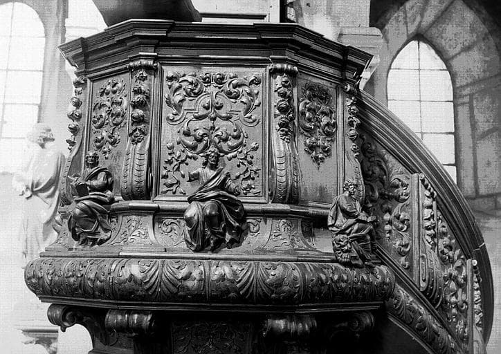 Sur la cuve se trouvent des statuettes des Evangélistes. L'abat-voix est surmonté d'un ange sonnant de la trompette, et est bordé de lambrequins.