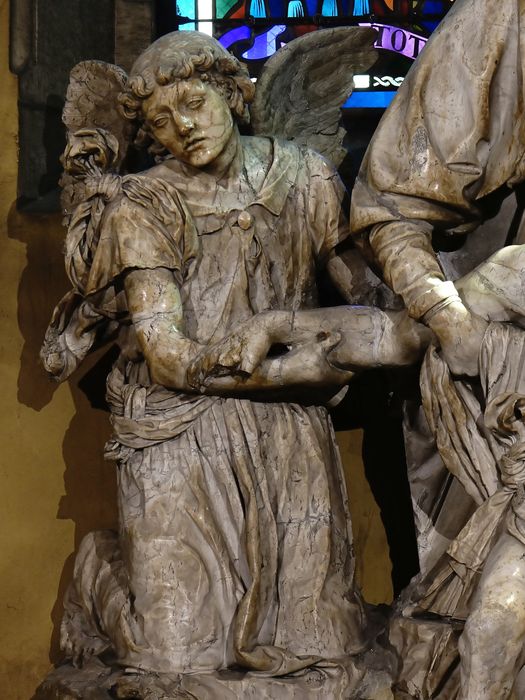 Groupe sculpté composé de 3 blocs d'albâtre : l'ange, le Christ et la Vierge. Présence d'une patte de fer pour fixation sur l'arrière senestre à mi-hauteur.