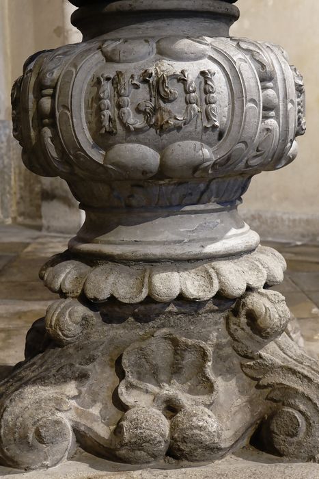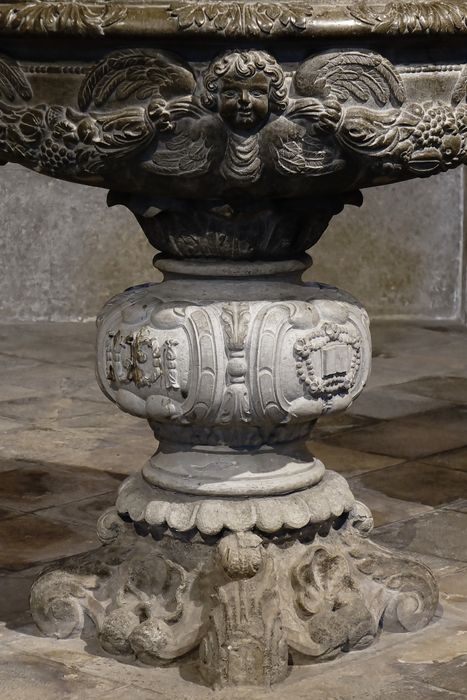 Ancien bénitier provenant de l'église des Jacobins de Besançon. Probablement déplacé à la cathédrale à la Révolution. Le couvercle semble avoir été refait à l'identique en 1939, l'ancien couvercle en tilleul étant complètement vermoulu (voir ref doc 1).