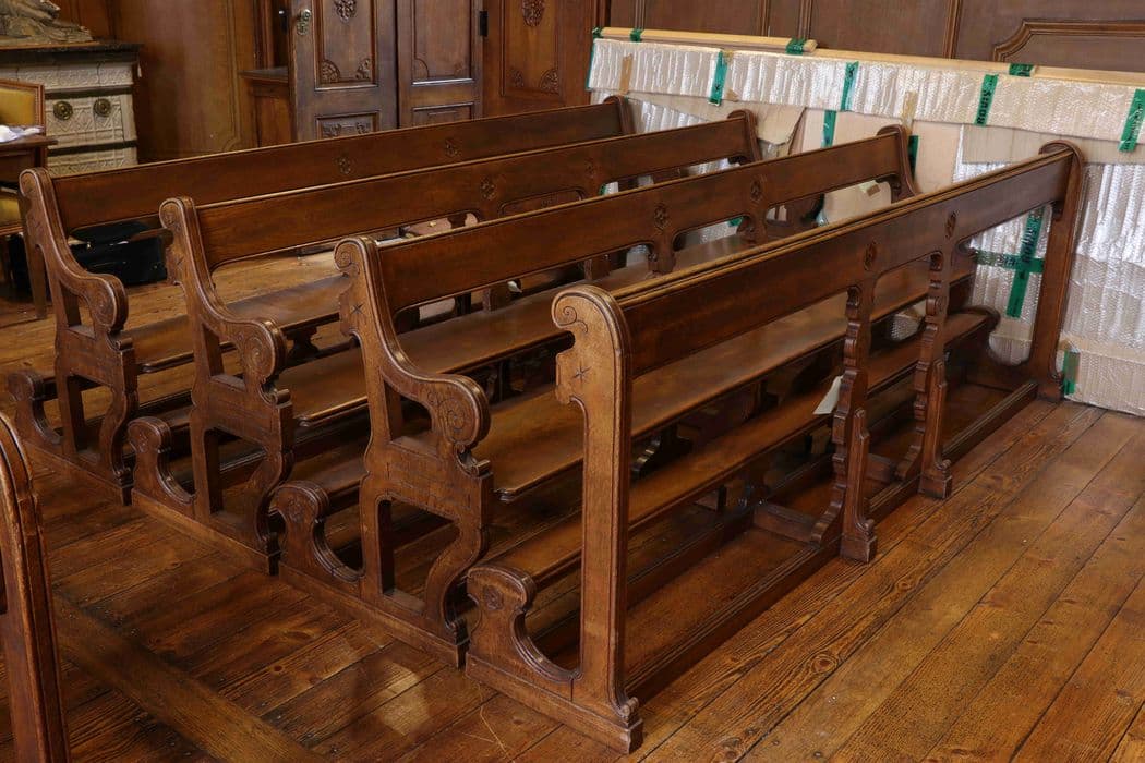 lambris de demi-revêtement ; armoire ; banc ; statue ; prie-Dieu ; agenouilloir ; confessionnal ; chandelier d'autel