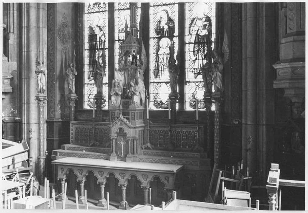 autel, tabernacle, exposition, 12 statues, croix d'autel et chandeliers, 2 niches, verrière