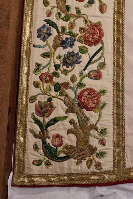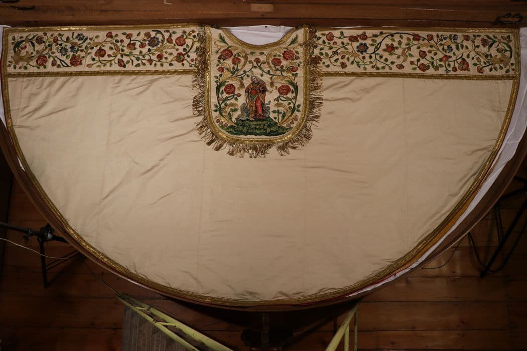 ornement liturgique catholique ; chape ; dalmatique (2) ; chasuble ; étole (2) ; voile de calice ; manipule (3)