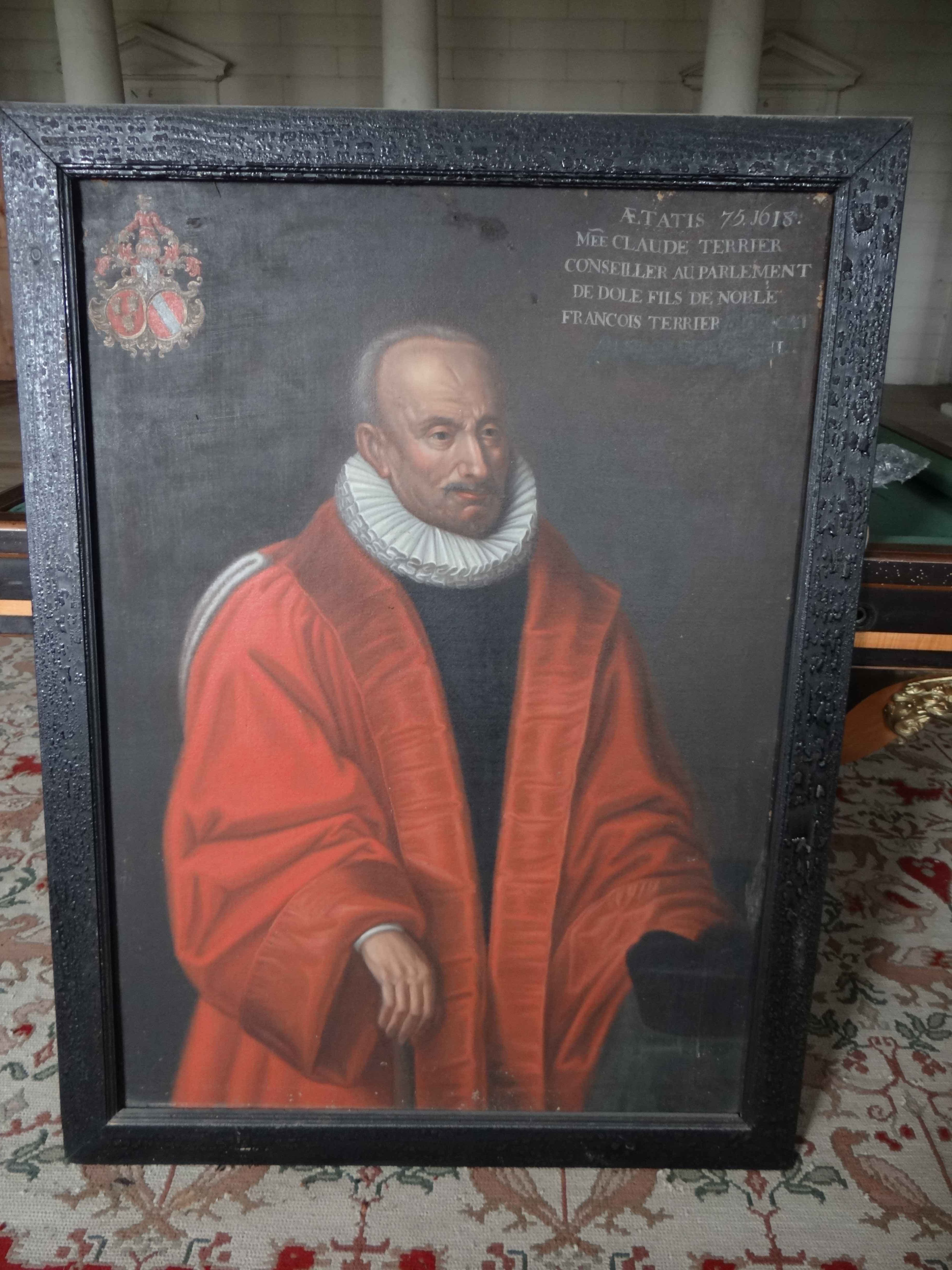 Inscription : AETATIS.75.1618 / MEE CLAUDE TERRIER /CONSEILLER AU PARLEMENT / DE DOLE FILSDE NOBLE / FRANCOIS TERRIER, le reste est effacé sur deux lignes : ADVOCAT / AU SIEGE DE VESOUL