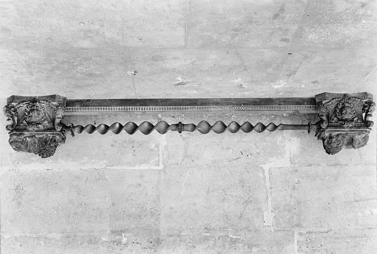 Elément de cheminée composé de deux barres horizontales, dont une torsadée, maintenues par deux éléments décoratifs faits de lions couchés sur des socles à têtes de lions.
