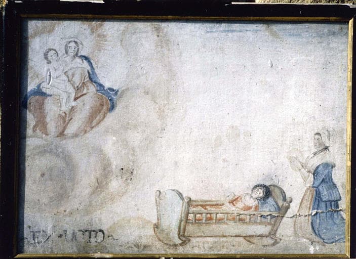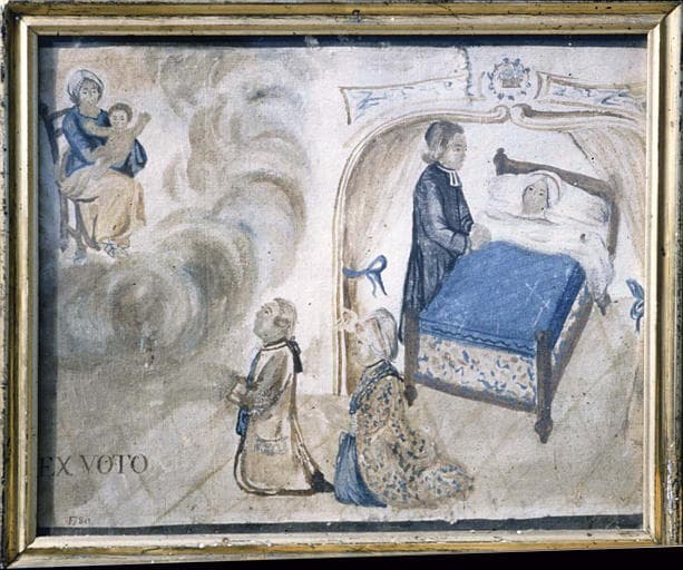 Un ex-voto adressé à la Vierge par une femme, à la gouache sur papier. Un ex-voto adressé à la Vierge par une femme pour la guérison de son enfant, à l'aquarelle sur papier. Un ex-voto adressé à la Vierge par un couple pour la guérison d'une malade, également à l'aquarelle sur papier.