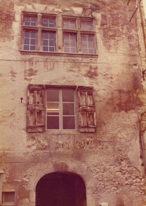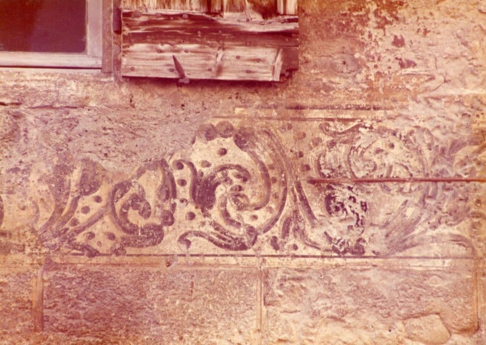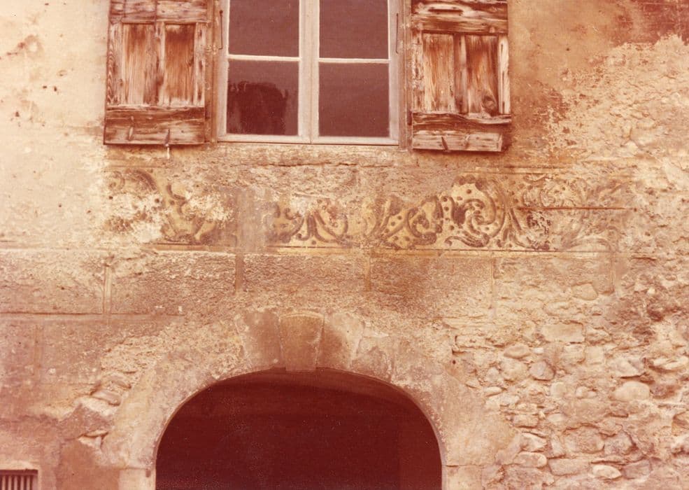 Décor des façades principale et latérale, des murs de l'escalier. Le décor peint sur le crépi des murs comprend des fausses briques de couleurs différentes figurant des losanges et des croix, de fausses pierres autour des baies et des chaînes d'angles en trompe-l'oeil : deux bandes horizontales de rinceaux. Sur les murs de l'escalier se retrouve le décor de rinceaux des façades. Décor des plafonds des paliers de l'escalier : faux caissons, rosaires et anges dans les tons ocres, bruns et rouges.