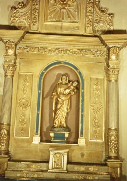 Retable en bois doré avec niche centrale cintrée contenant une statue de la Vierge à l'Enfant. De part et d'autre de la niche, des motifs de couronnes de fleurs, d'étoile et d'ornements dans des panneaux moulurés. Aux extrémités du retable des colonnes dont la partie supérieure est cannelée, supportant un court entablement orné d'une tête d'ange et d'une frise de denticules. Fronton à ailerons avec motif central.