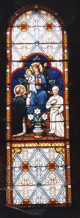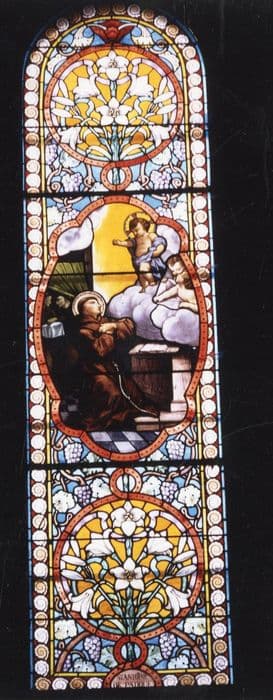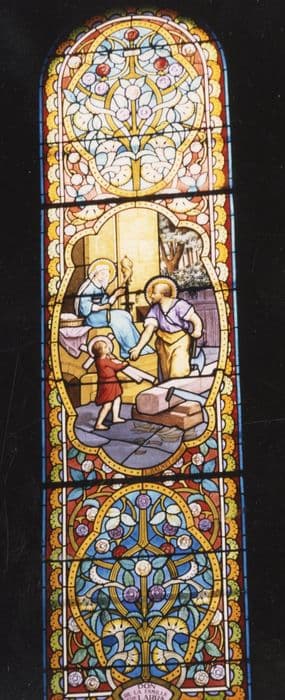 POP | Plateforme ouverte du patrimoinedix verrières de la nef et du transept : Sainte Famille à l'atelier, Christ et Samaritaine, Tentations de saint Antoine, Remise du rosaire, Saint Antoine de Padoue, Mort de saint Joseph, Charité de saint Martin, Mort d'un saint, Apparition de Lourdes et Apparition du Christ à une religieuse