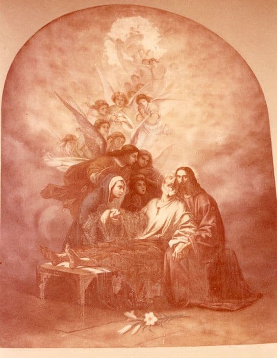 sept tableaux : Apparition de Notre-Dame de Lourdes, Portement de croix, Assomption de la Vierge, Apparition du Sacré-Coeur, Pentecôte, Mort de saint Joseph et Cène