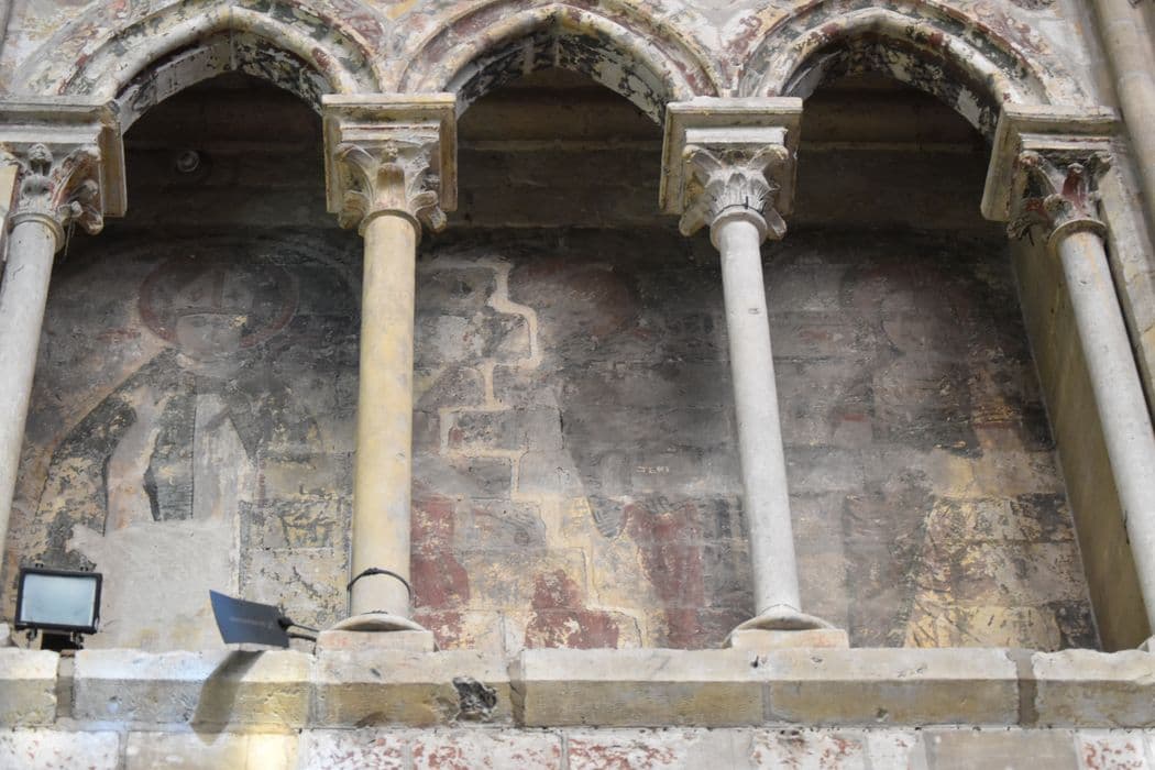 Ces peintures représentent des saints divers : saint Laurent et sainte Clotilde, un saint vêtu en diacre (saint Mathurin), saint Jean-Baptiste, le Christ en croix entre la Vierge et saint Jean, saint Jacques le Majeur et saint Christophe, une sainte sous attribut et un second personnage disparu, un évêque et un chevalier (saint Adrien ?), une sainte tenant la palme du martyre, etc.