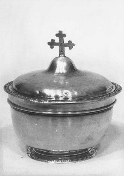 Cette boîte à hosties est surmontée d'une croix.