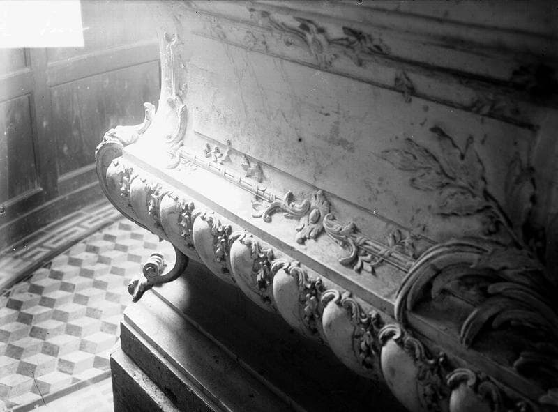 En arrière, un occulus vitré permettait de voir les reliques enfermées dans le tombeau. Il y a également une ouverture circulaire en avant, mais elle est garnie d'un remplage. Le tombeau a des formes contournées. Le tabernacle, peu important, aux formes contournées, repose sur un gradin. L'autel est peint en blanc avec des rehauts de dorure sur la face antérieure seulement. L'exposition est complètement dorée. La table de l'autel est en marbre.