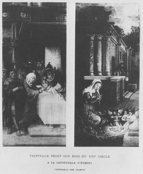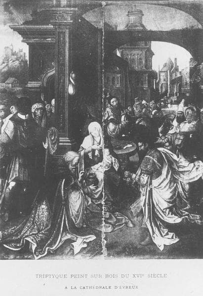triptyque (panneaux peints) : l'Adoration des Mages, les Anges adorant l'Enfant Jésus, la Présentation au Temple (œuvre volée)