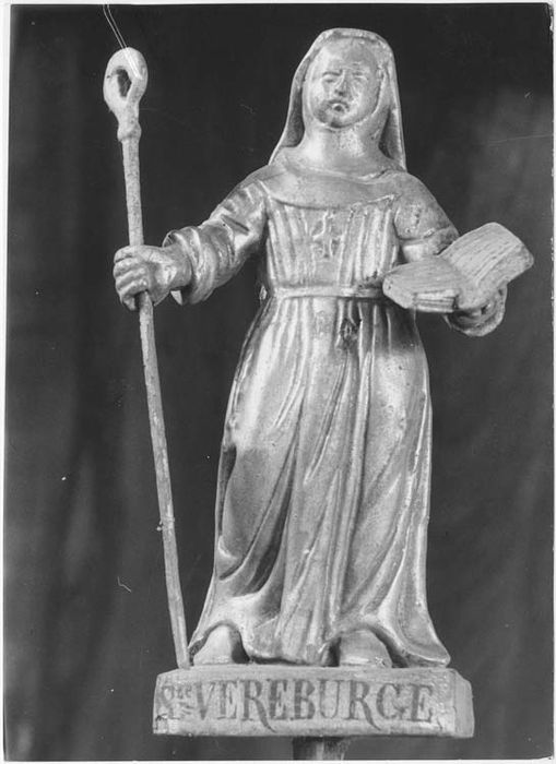 Sainte Vereburge est coiffée d'une guimpe à mentonnière et d'un voile ; elle tient la crosse dans la main droite et un livre ouvert dans la main gauche ; chaussures fermées à bouts pointus.