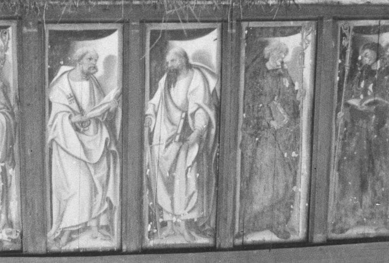 devant de l'autel secondaire sud (panneau peint) : Saint Blaise (?), Saint abbé, Saint Pierre, Saint Paul, Deux abbés vêtus de noir