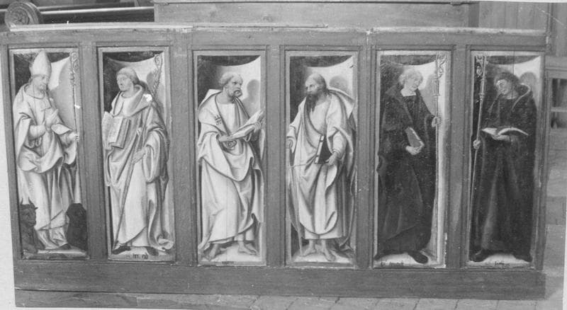 POP | Plateforme ouverte du patrimoinedevant de l'autel secondaire sud (panneau peint) : Saint Blaise (?), Saint abbé, Saint Pierre, Saint Paul, Deux abbés vêtus de noir