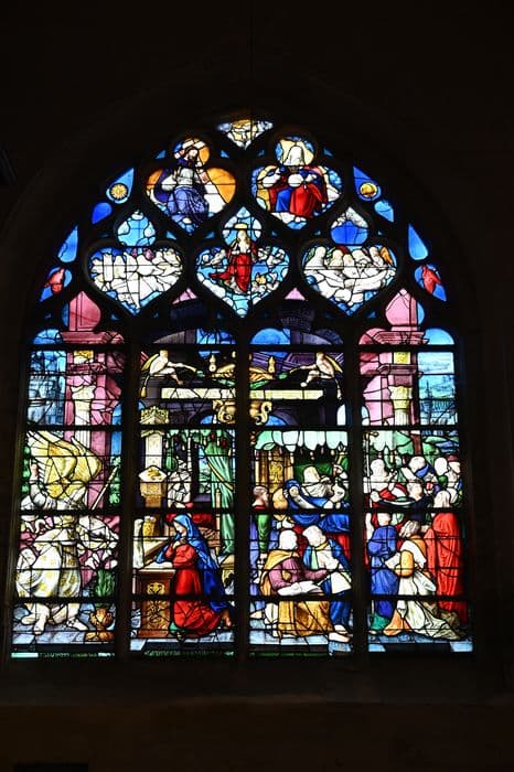 Ces verrières représentent : le Triomphe de la Vierge (grande fenêtre de la façade), l'Annonciation, la Mort de la Vierge et l'Assomption (fenêtre du croisillon sud).